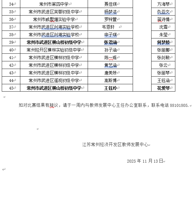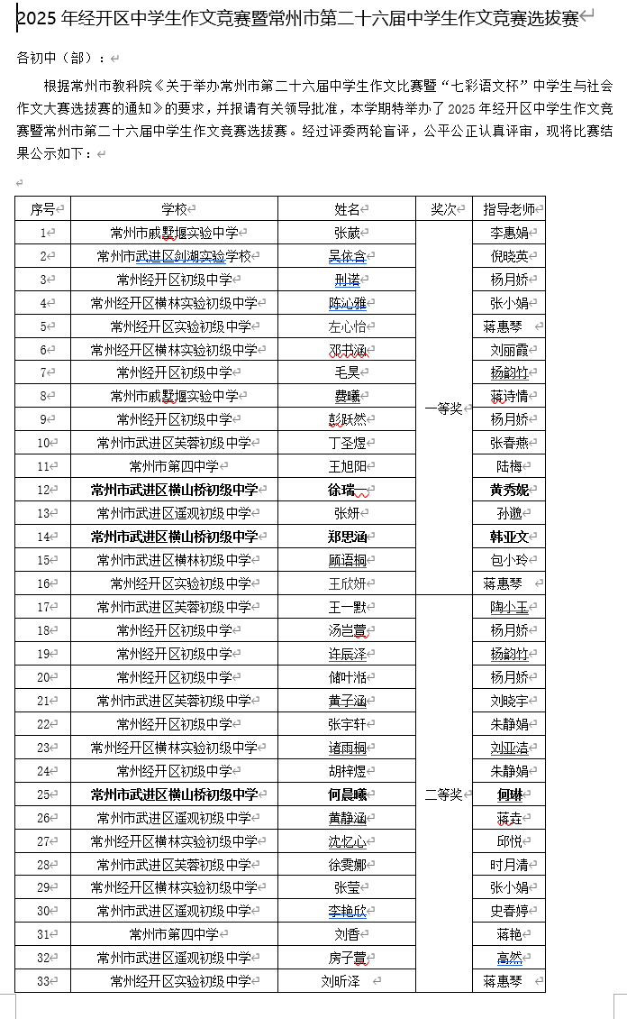 2025年经开区中学生作文竞赛暨常州市第二十六届中学生作文竞赛选拔赛结果公示