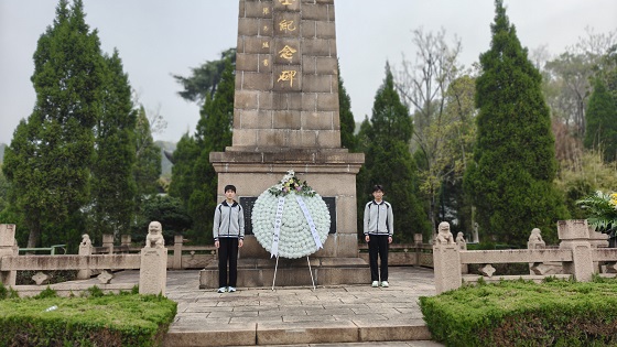 澄西烈士陵园内,全体师生齐声高唱中华人民共和国国歌,嘹亮的歌声回荡在陵园上空。师生们心怀敬畏,集体肃立默哀,向革命烈士致以最深切的哀悼与最崇高的敬意。默哀毕,学生代表缓步走向革命烈士纪念碑,郑重敬献花圈,以鲜花寄哀思,以行动表初心。