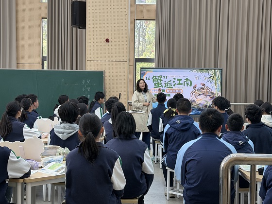 活动在横山桥初中蒋梦姣老师的公开课《“邂逅江南”——长江三角洲地区》中拉开帷幕。蒋老师以“阳澄湖大闸蟹经销商”角色创设情境,围绕“寻蟹—养蟹—卖蟹—夸蟹”四大任务,引导学生从地理位置、自然特征、区域发展、城乡融合、水乡特色文化宣传等维度探究长江三角洲地区。课堂中,学生化身“蟹商代表”,借助AI视频鉴定蟹中之王,通过读图与小组合作探究地形、气候、水文对大闸蟹生长的影响,解码“鱼米之乡”的生态密码;在“卖蟹”环节,结合材料探讨城乡互补与上海辐射作用,分析人口、市场、交通及品牌优势对大闸蟹销路的影响;最后通过AI辅助创作宣传文案,并布置课后拓展任务:以“蟹商文化大使”身份设计“文化+蟹业”主题的两日游路线。整堂课以真实情境驱动,任务层层递进,融入乡土地理,体现了“做中学”的跨学科主题教学理念。