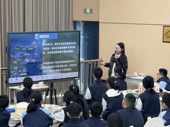 紧接着,横山桥初中沈驰原老师执教《瑞幸的“生椰帝国”——东南亚》。沈老师以瑞幸“生椰拿铁”为切入点,创设“特派员探秘”情境,围绕“启程定位—考察探秘—新品研发—市场选址”四大任务推进。学生运用地图锁定东南亚“十字路口”位置,结合气候图表探究邦盖群岛热带雨林气候如何造就椰子优质品质;通过“数字人求助”视频,综合分析泰国热带季风气候与水稻种植的有利条件,并借助AI工具设计东南亚风味饮品,完成新品研发挑战;最后以“选址听证会”为延伸任务。整节课融合真实商业案例、气候分析、产品设计与AI应用,体现了跨学科主题教学的实践性与创新性。