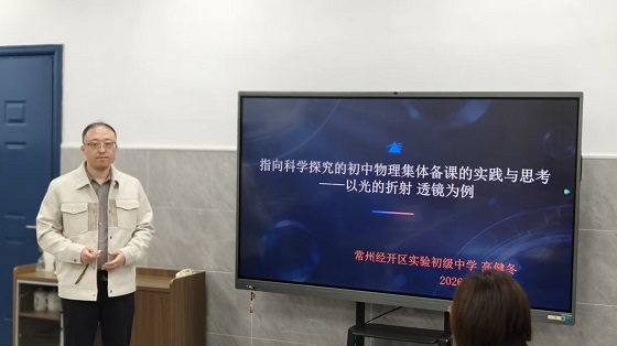 高健冬老师作题为《指向科学探究的初中物理集体备课的实践与思考——以光的折射透镜为例》的讲座。他以“光的折射 透镜”单元备课为例,生动展示了如何围绕科学探究要素进行单元整体设计,实现智慧与个性施教的有机融合。